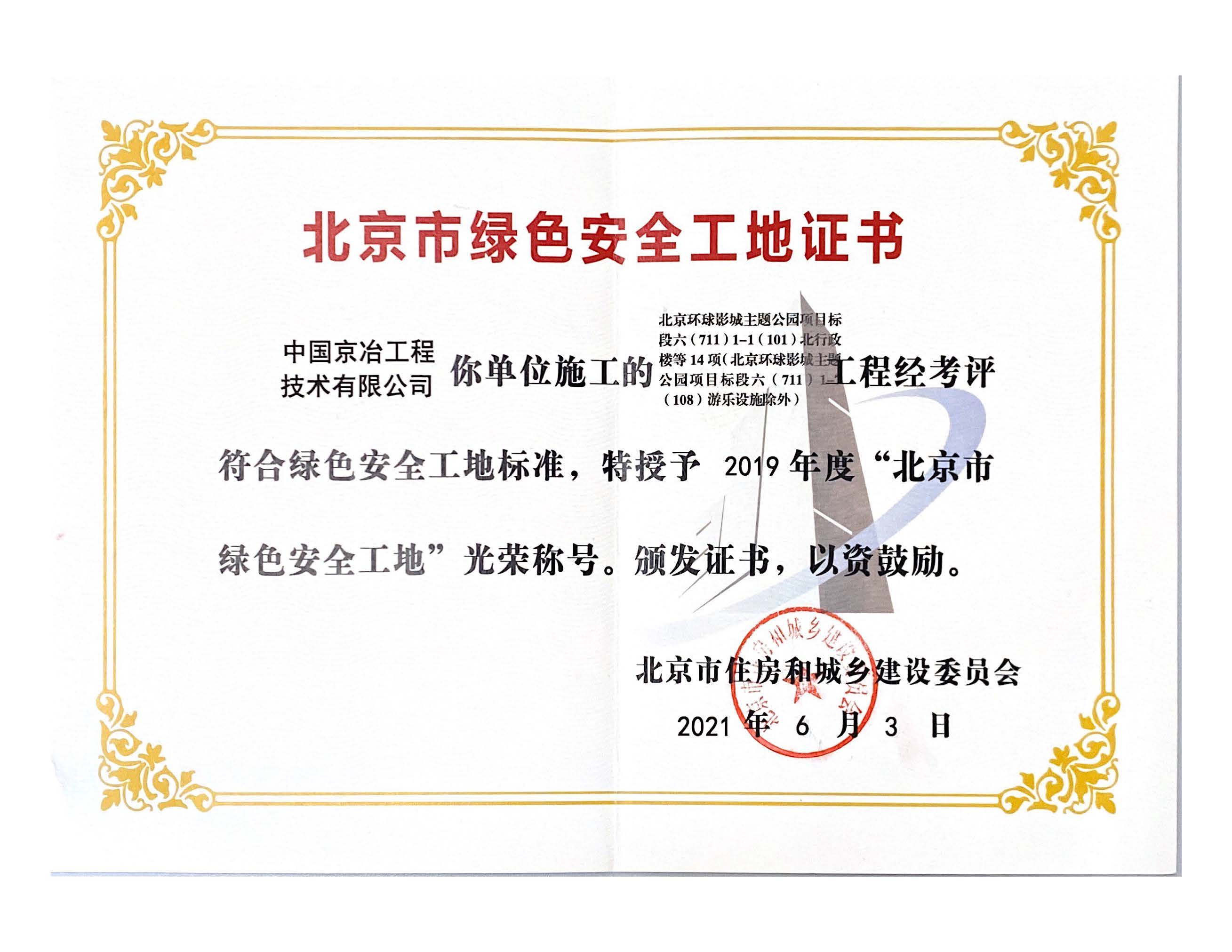 2019年度北京市绿色安全工地证书-北京环球影城